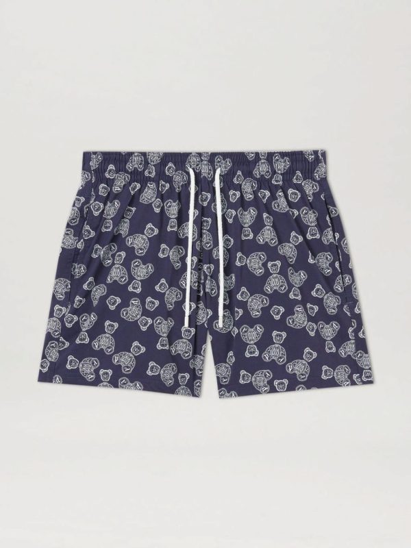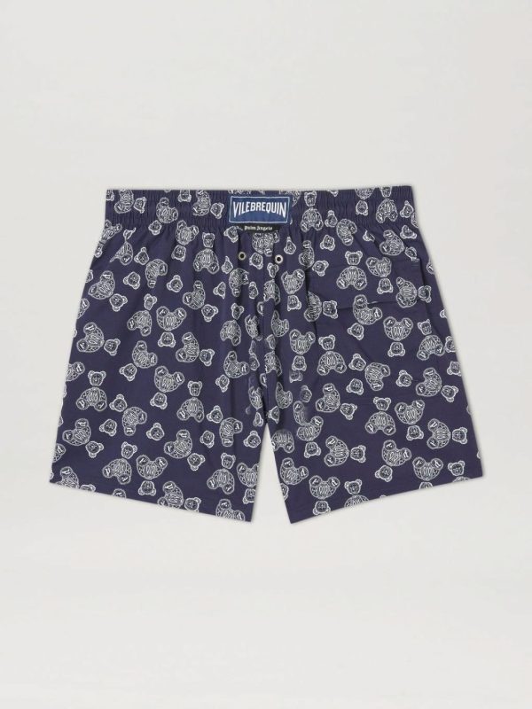 PAXVILEBREQUIN SWIMWEAR PANTS IN BLUE WITH PAISLEY BEAR GRAPHIC PRINTED ALL OVER IN WHITE. “VILEBREQUIN” AND “PALM ANGELS” LABELS SEWN AT BACK. ELASTIC WAISTBAND AND WHITE DRAWSTRINGS. SIDE POCKETS AND BACK POCKET WITH VELCRO FLAP.