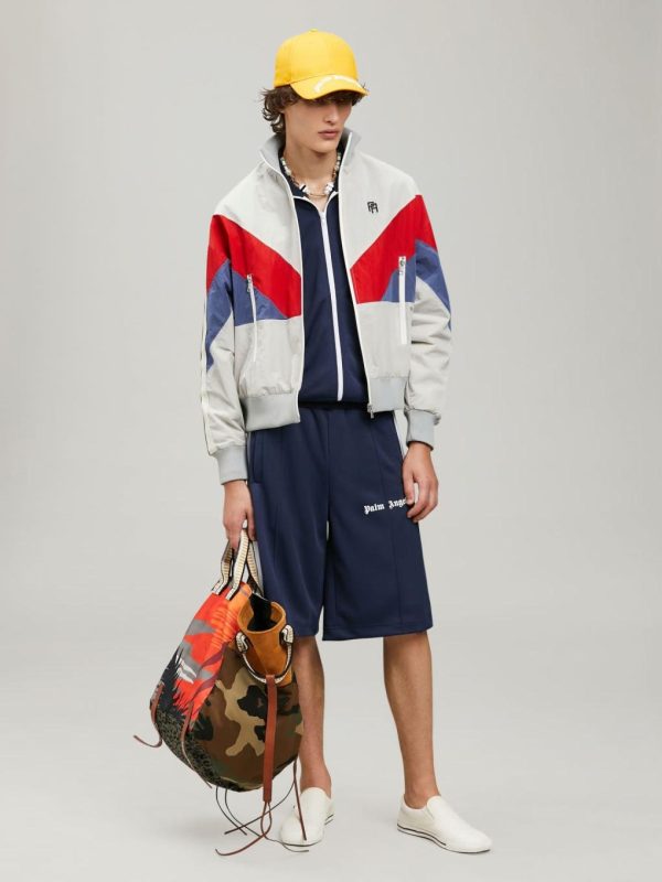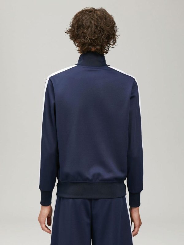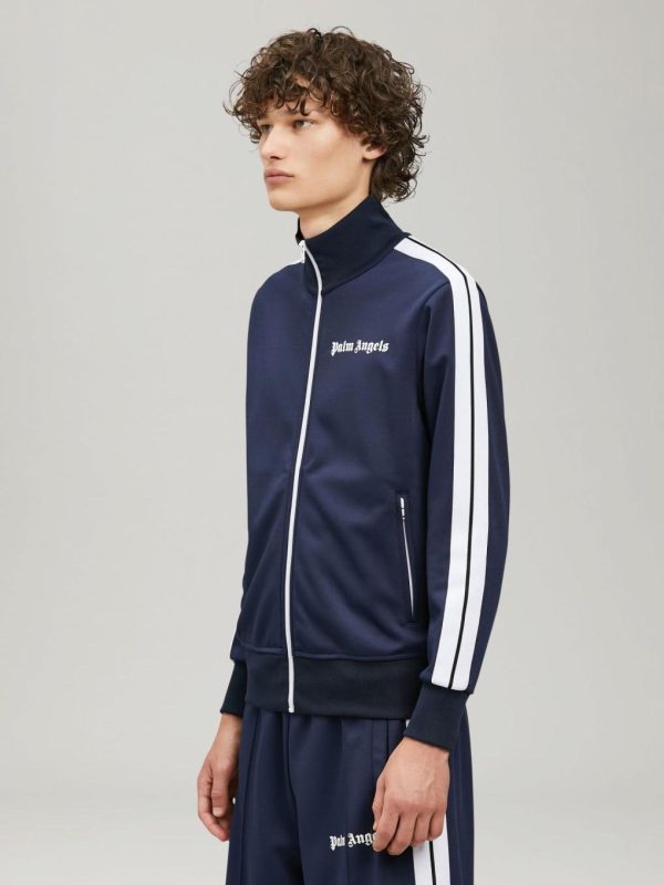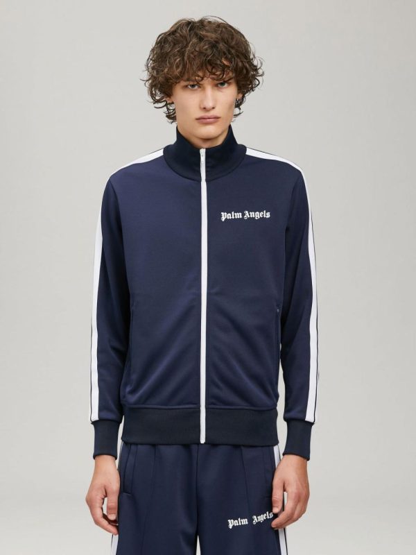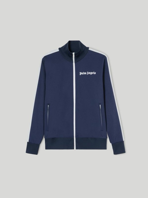 LONG SLEEVES TRACK JACKET IN NAVY BLUE WITH WHITE “PALM ANGELS” LOGO PRINTED AT FRONT. RIB KNIT CUFFS, COLLAR AND HEM. ZIP CLOSURE IN WHITE. TWO ZIP POCKETS. WHITE STRIPES AT SLEEVES.