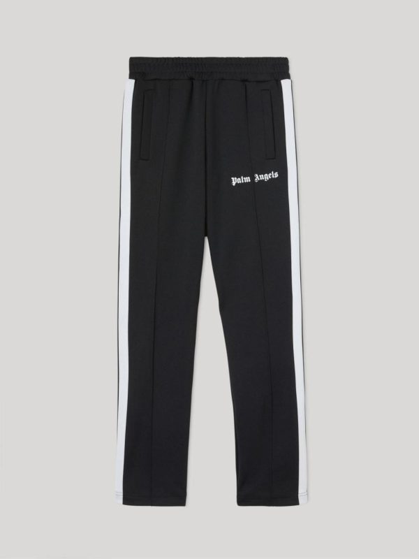 LONG TRACK PANTS IN BLACK. ELASTICIZED WAISTBAND. TWO-POCKET STYLING. CENTRAL PINCH SEAMS AND PALM ANGELS LOGO PRINTED AT FRONT. WHITE STRIPES AT SIDE LEGS. ZIP CLOSURE AT ANKLE CUFFS