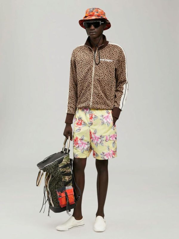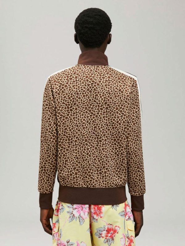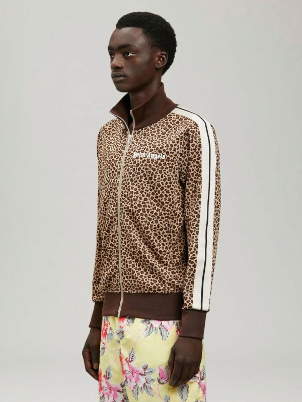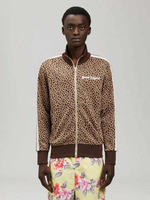 LONG SLEEVES LEOPARD TRACK JACKET. WHITE “PALM ANGELS” LOGO PRINTED ON CHEST. BROWN RIB KNIT CUFFS, COLLAR AND HEM. ZIP CLOSURE. TWO ZIP POCKETS. BEIGE STRIPES AT SLEEVES.