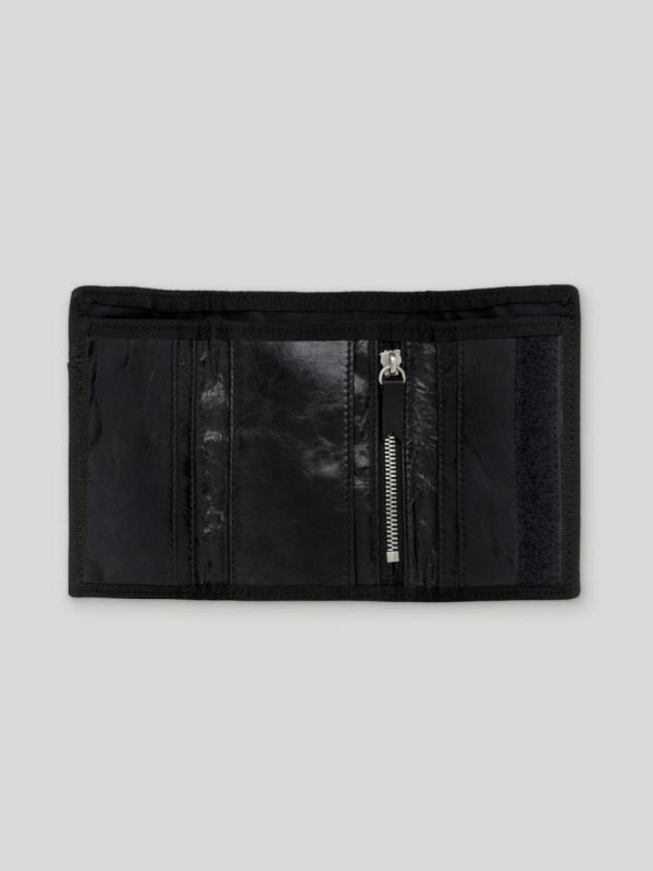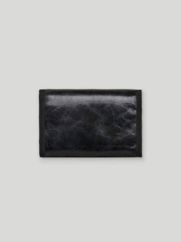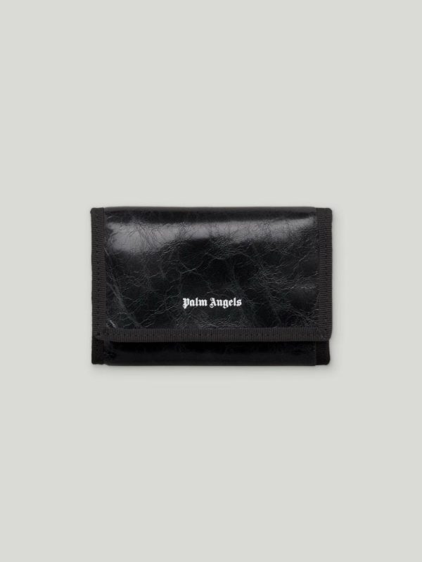 Black crinckled leather wallet featuring”Palm Angels” logo printed in white at front.