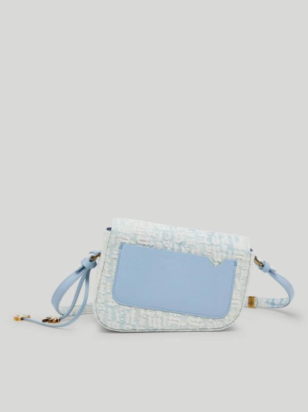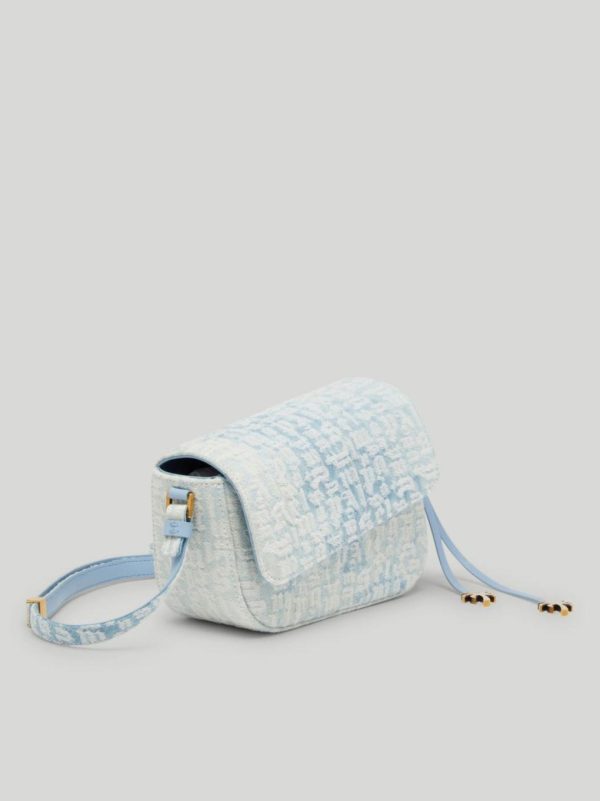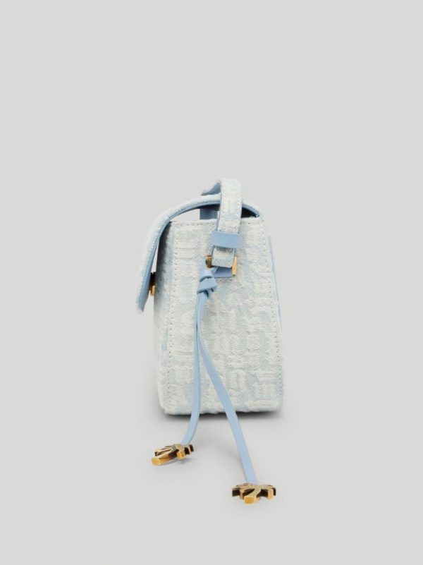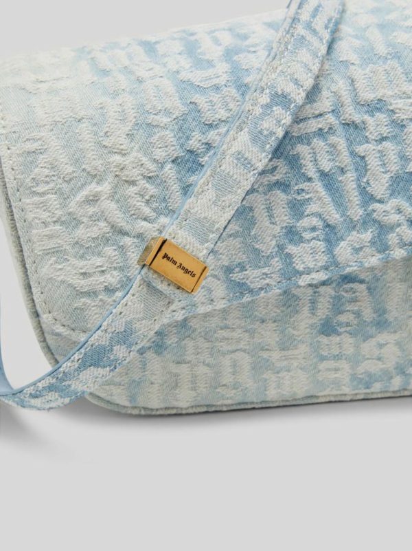 MONOGRAM CRASH BAG IN LIGHT BLUE DENIM. MONOGRAM SHOULDER STRAP. GOLD PALM TREE DETAIL.