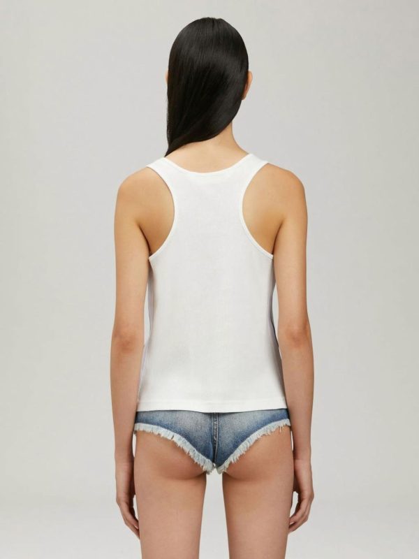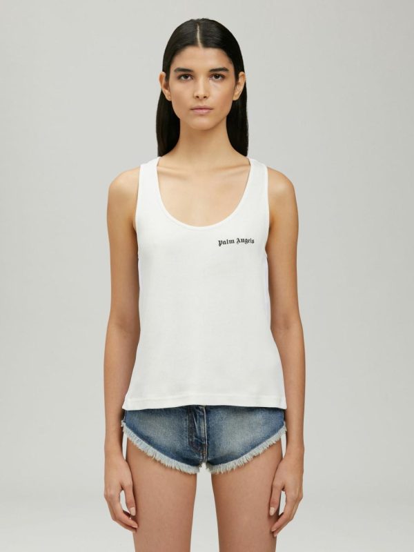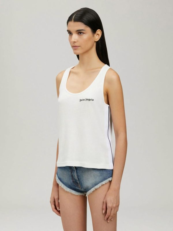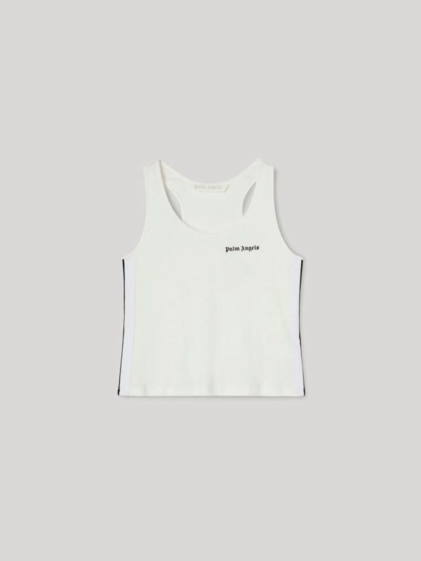 TANK TOP IN WHITE WITH “PALM ANGELS” LOGO PRINTED IN BLACK AT CHEST. WHITE AND BLACK STRIPES AT SIDES.