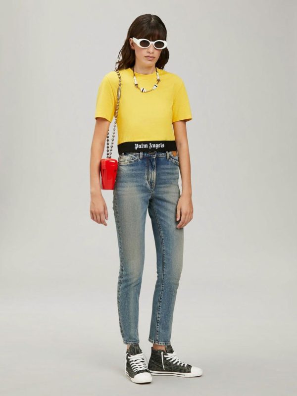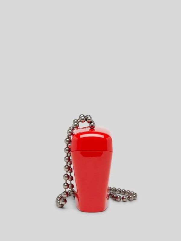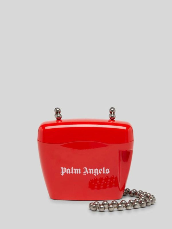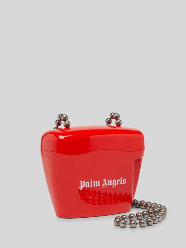 RIGID SHOULDER BAG IN RED. “PALM ANGELS” LOGO PRINTED IN WHITE AT FRONT. BALL CHAIN SHOULDER STRAP. PADLOCK CLOSURE AT SIDE.