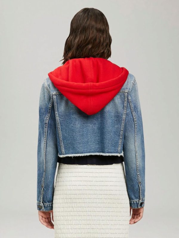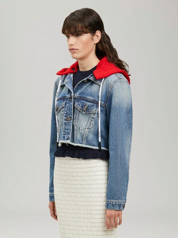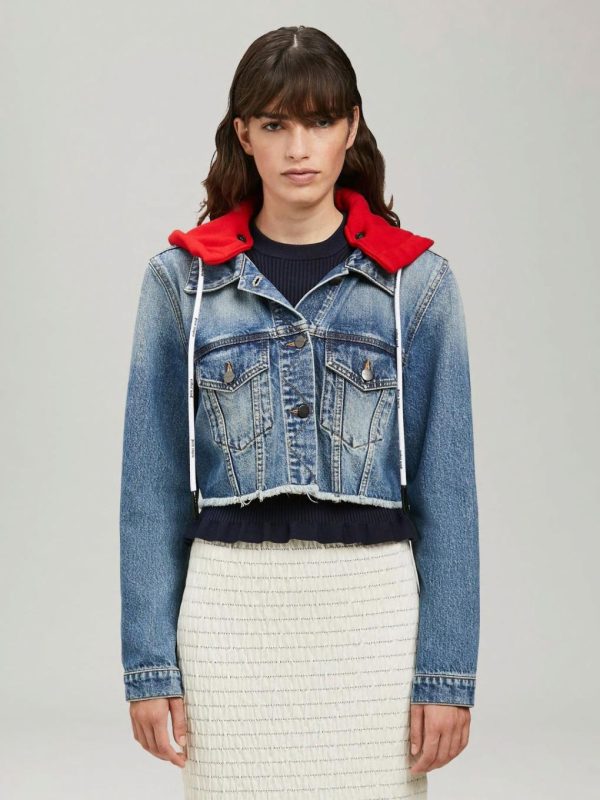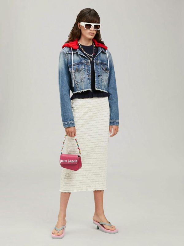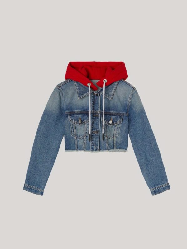LONG SLEEVES HOODED CROPPED DENIM JACKET IN BLUE WASH. “PALM ANGELS” LOGO PRINTED AT BACK. SPREAD COLLAR. BUTTON CLOSURE AT FRONT. FLAP POCKETS AT CHEST. RED FLEECE HOOD FEATURING WHITE LOGOED DRAWSTRINGS.