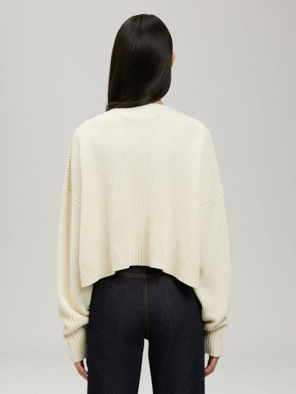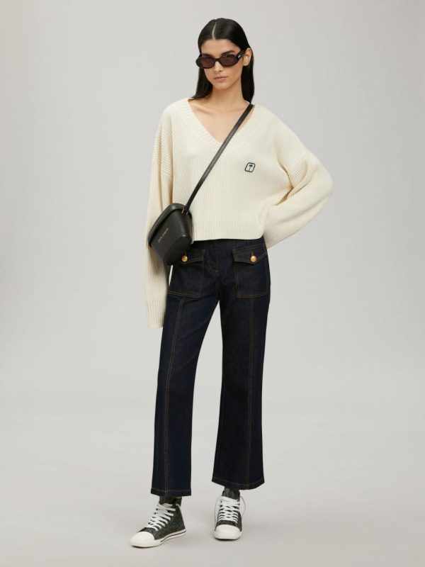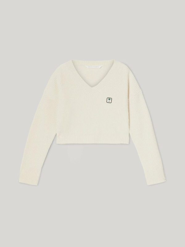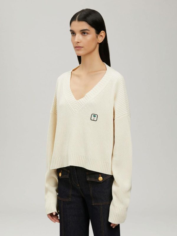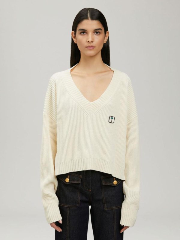 LONG SLEEVES WHITE SWEATER WITH “PALM ANGELS” PATCH SEWN AT FRONT. V NECK COLLAR. RIB KNIT CUFFS AND HEM.