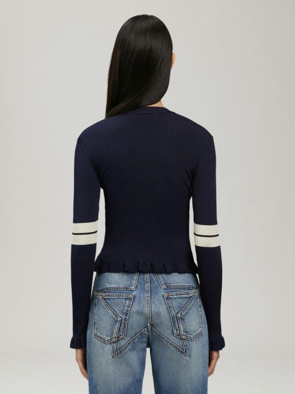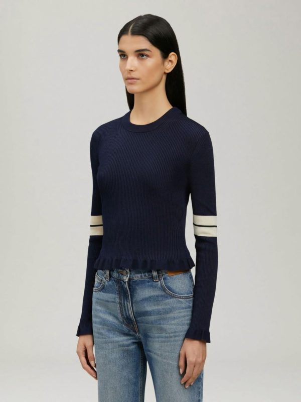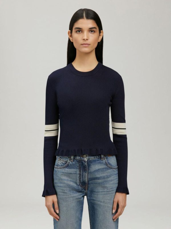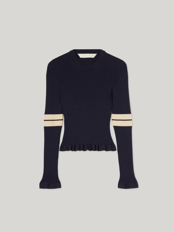 LONG SLEEVES KNITTED TOP IN NAVY BLUE. WHITE STRIPES DETAIL ON ARMS, ROUND NECK. STRETCH-DESIGN. RIB KNIT COLLAR. CURLY HEM AND CUFFS.