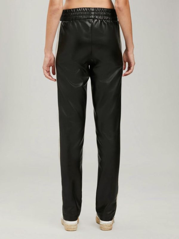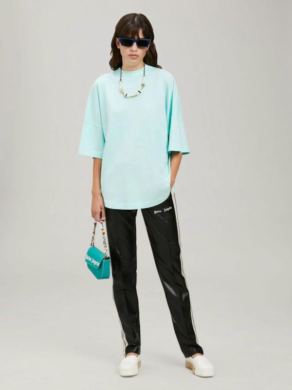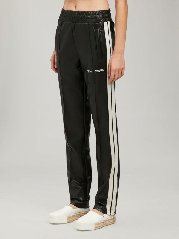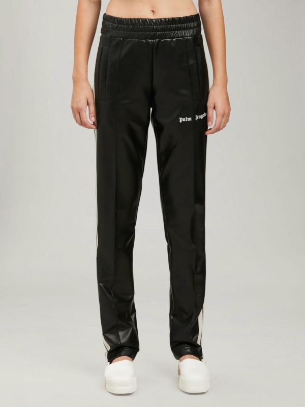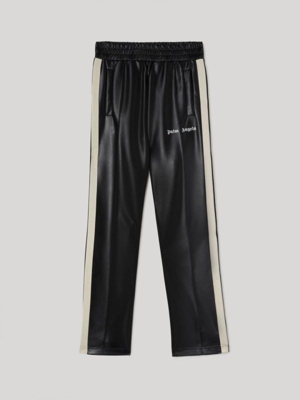 LONG LEATHER TRACK PANTS IN NAVY BLUE. ELASTICIZED WAISTBAND. TWO-POCKET STYLING AT FRONT. WHITE STRIPES AT SIDE LEGS. CENTRAL PINCH SEAMS. “PALM ANGELS” LOGO PRINTED IN WHITE AT FRONT.