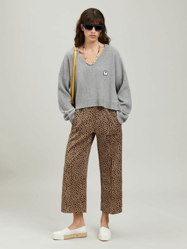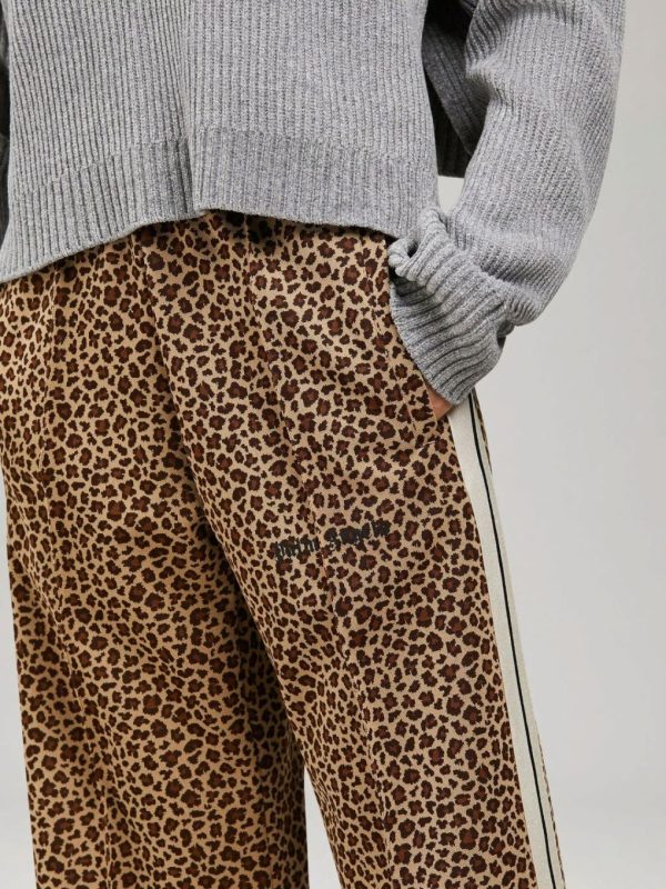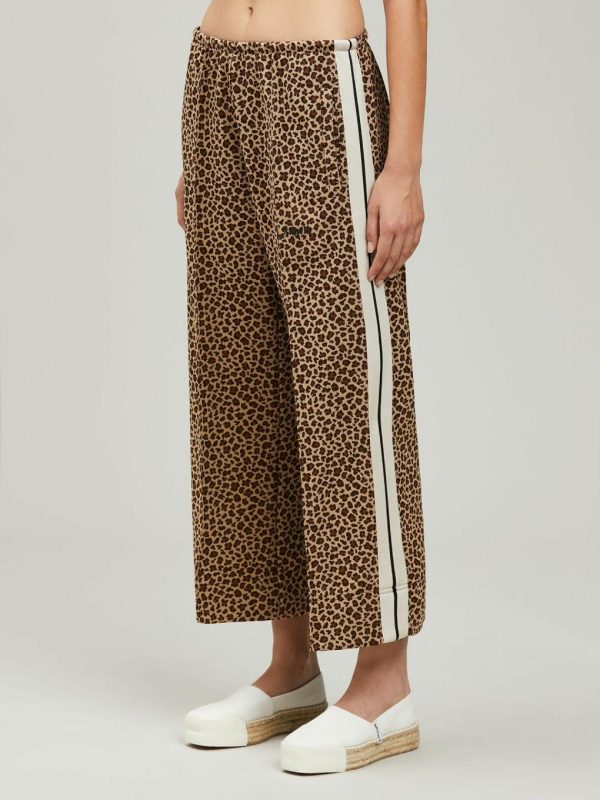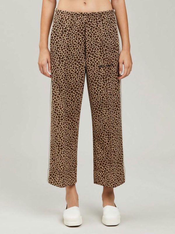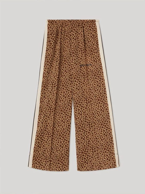 LONG CROPPED TRACK PANTS IN BROWN FEATURING ANIMALIER GRAPHIC PRINTED ALL OVER. ELASTICIZED WAISTBAND. TWO-POCKET STYLING. WHITE STRIPES AT SIDE LEGS. CENTRAL PINCH SEAMS AND “PALM ANGELS” LOGO PRINTED AT FRONT IN BLACK.