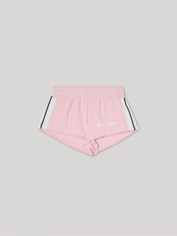 TRACK MINI SHORTS IN BLOSSOM PINK WITH “PALM ANGELS” LOGO PRINTED IN WHITE AT FRONT. ELASTICIZED WAISTBAND. WHITE STRIPES AT SIDE LEGS. CENTRAL PINCH SEAMS.