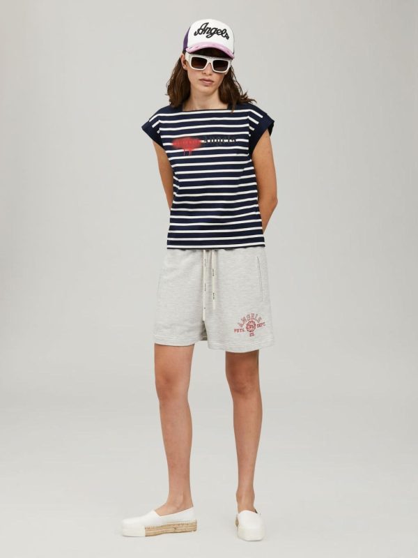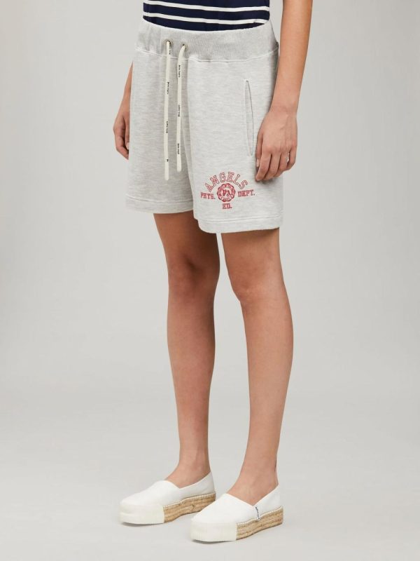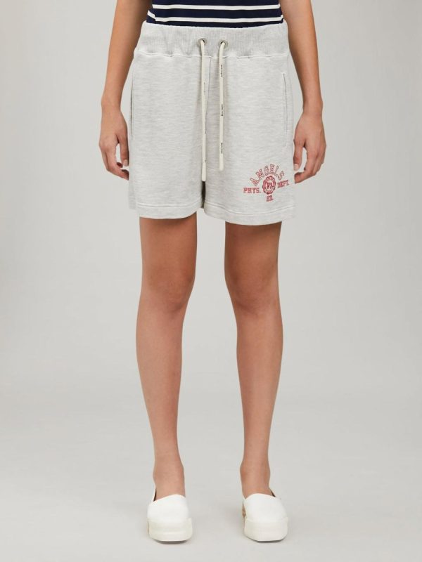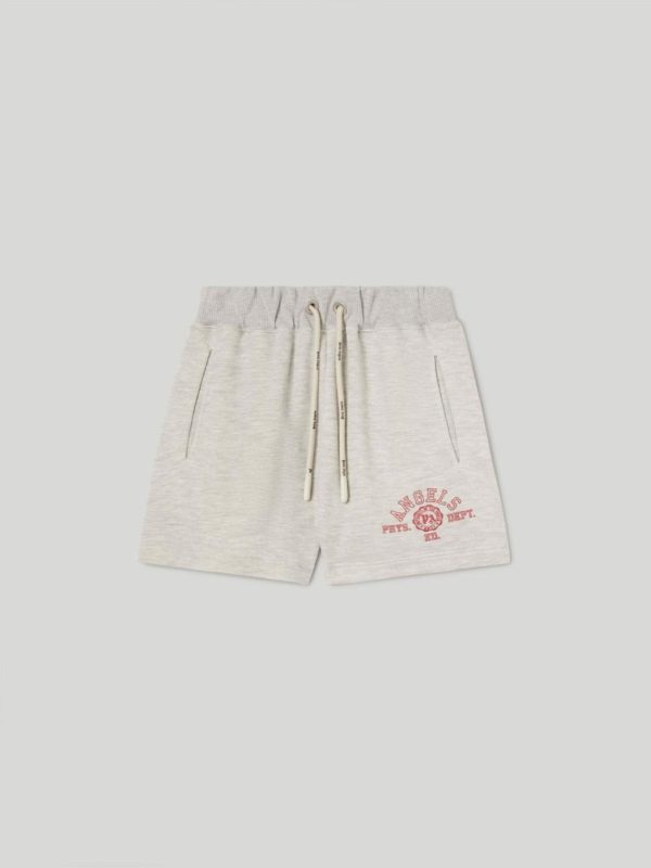 SWEATSHORTS IN MELANGE GREY WITH “PALM ANGELS” COLLEGE LOGO PRINTED IN RED AT FRONT. ELASTICIZED WAISTBAND. WHITE LOGOED DRAWSTRINGS. TWO STYLING POCKETS AT FRONT AND ONE AT BACK.