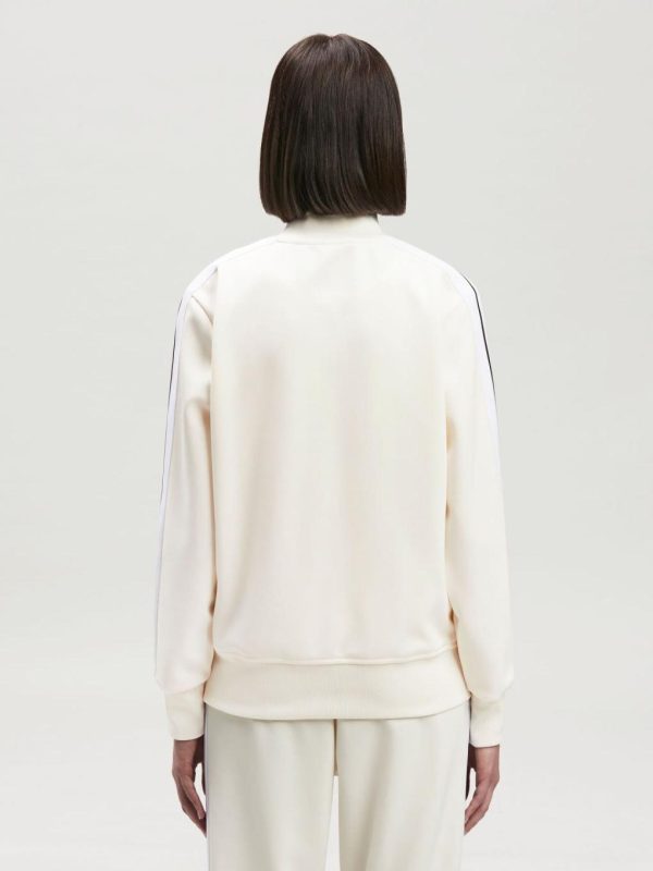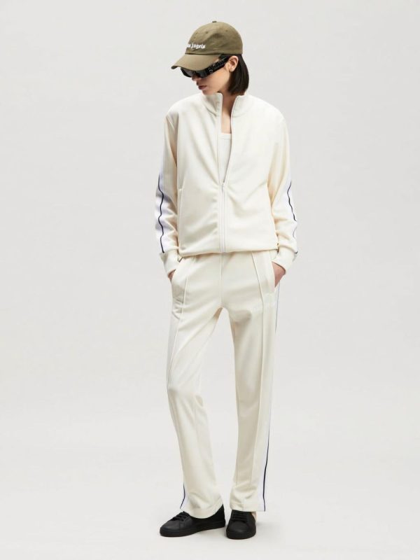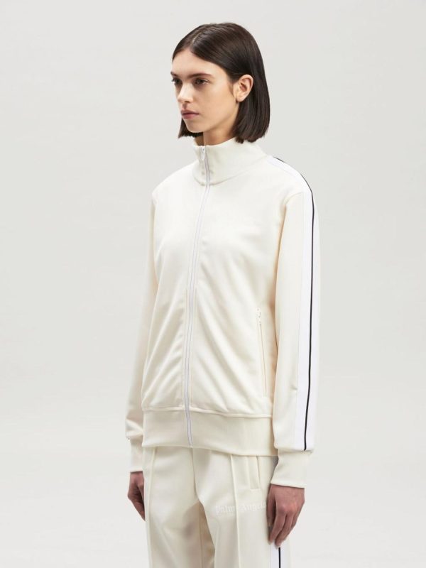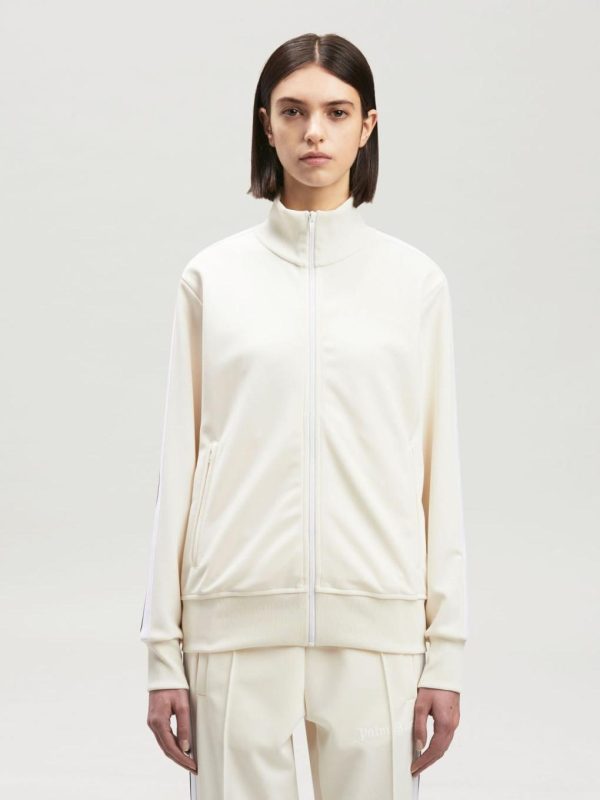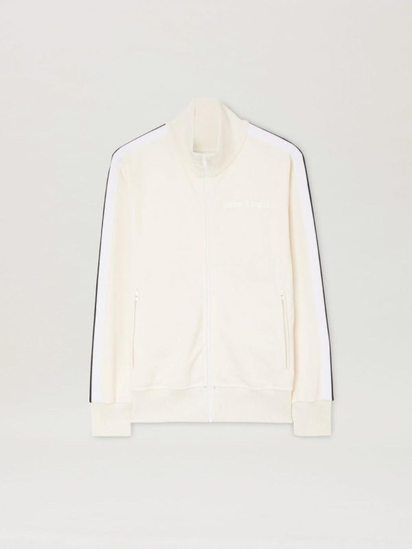 LONG SLEEVES TRACK JACKET IN WHITE ACETATE WITH WHITE “PALM ANGELS” LOGO PRINTED AT FRONT. RIB KNIT CUFFS, COLLAR AND HEM. ZIP CLOSURE IN WHITE. TWO ZIP POCKETS. WHITE STRIPES AT SLEEVES.