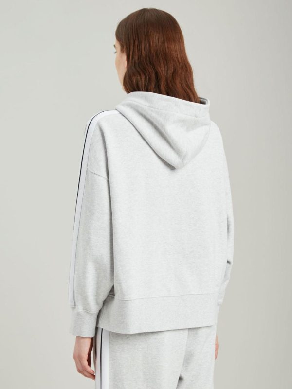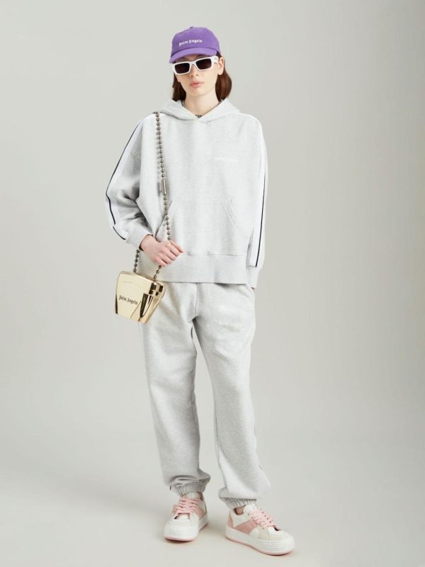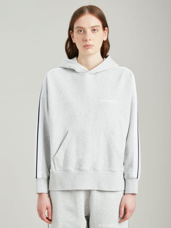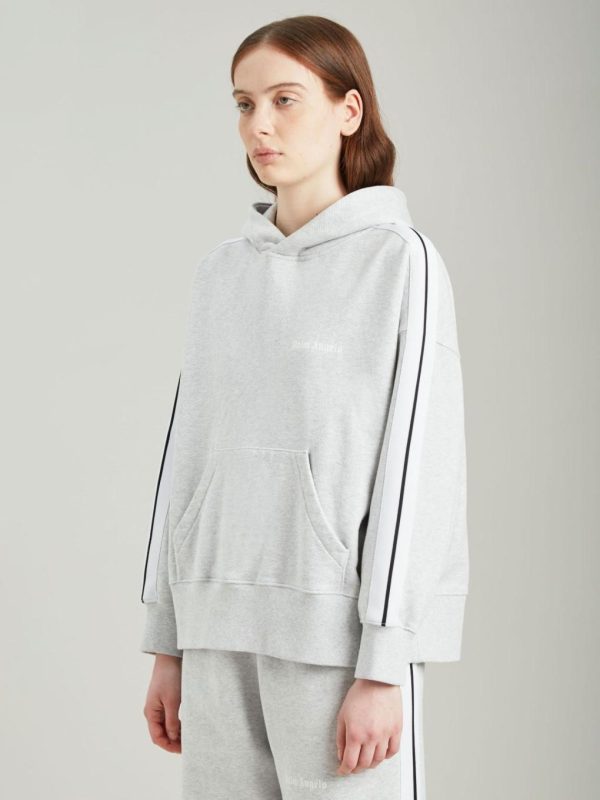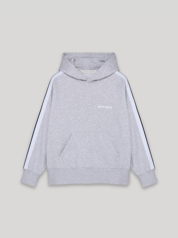 LONG SLEEVES GREY HOODIE WITH “PALM ANGELS” LOGO PRINTED IN WHITE AT FRONT. WHITE STRIPES AT SLEEVES.