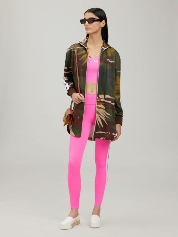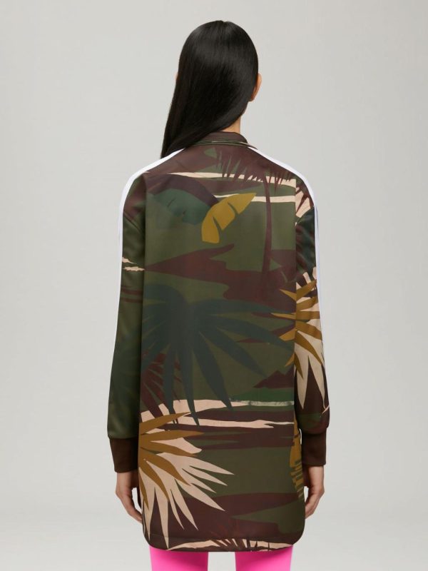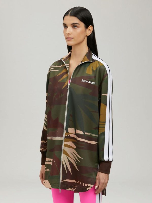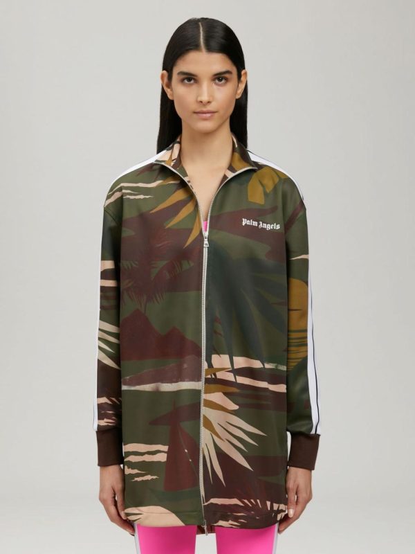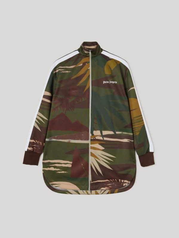 GIACCA SPORTIVA A MANICHE LUNGHE VERDE MILITARE CON STAMPA GRAFICA JUNGLE ALL-OVER. STAMPA DEL LOGO “PALM ANGELS” BIANCA SUL DAVANTI. CHIUSURA A ZIP. STRISCE BIANCHE SUL LATO DELLE GAMBE. ORLO ARROTONDATO. TAGLIO LUNGO.