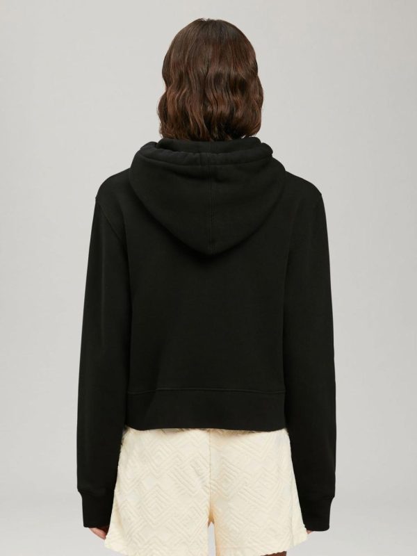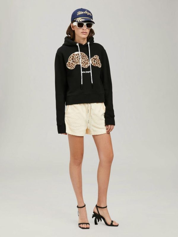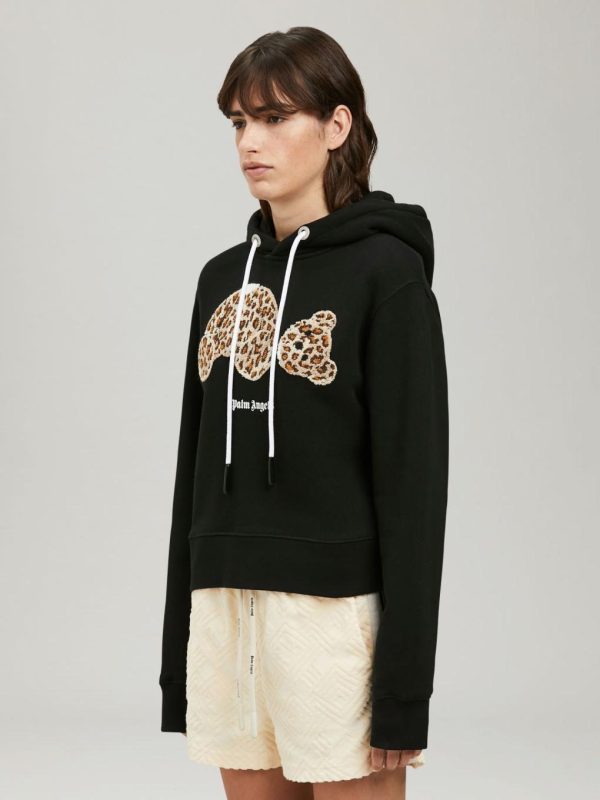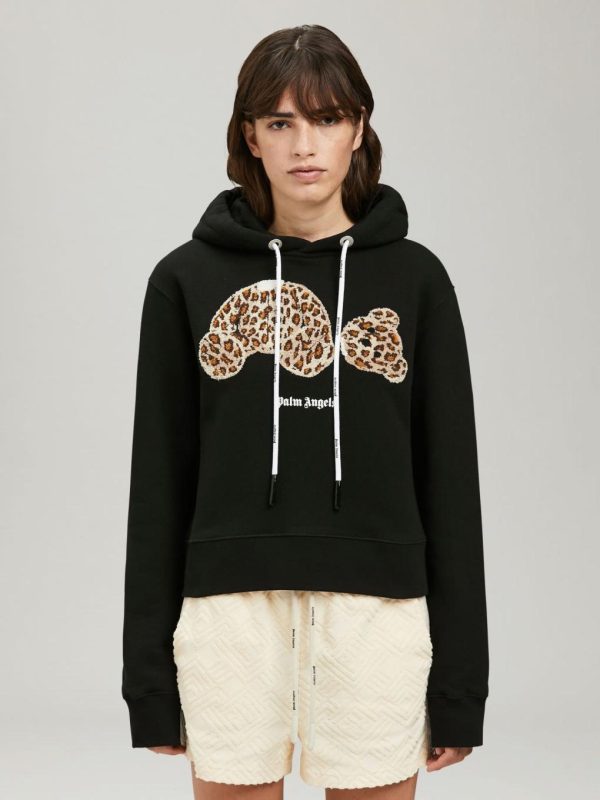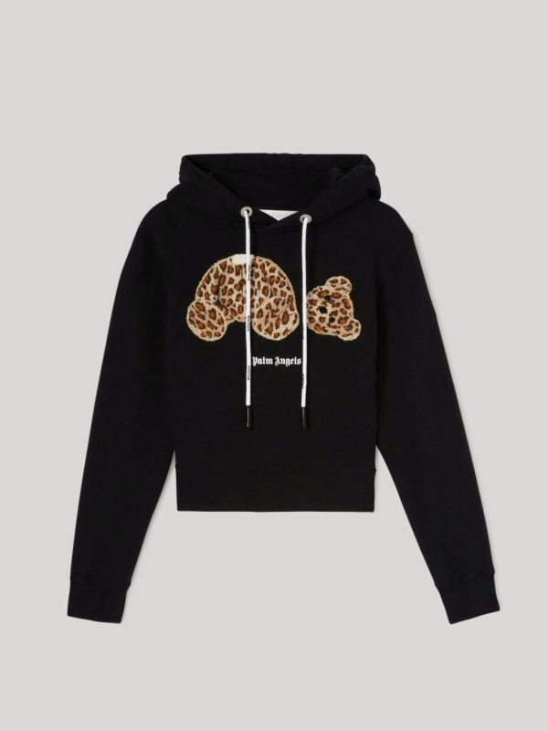 LONG SLEEVES FITTED HOODED SWEATSHIRT IN BLACK WITH LEOPARD BEAR PATCH SEWN AT FRONT. “PALM ANGELS” LOGO PRINTED IN WHITE AT FRONT. RIB KNIT CUFFS AND HEM. WHITE LOGOED DRAWSTRINGS.