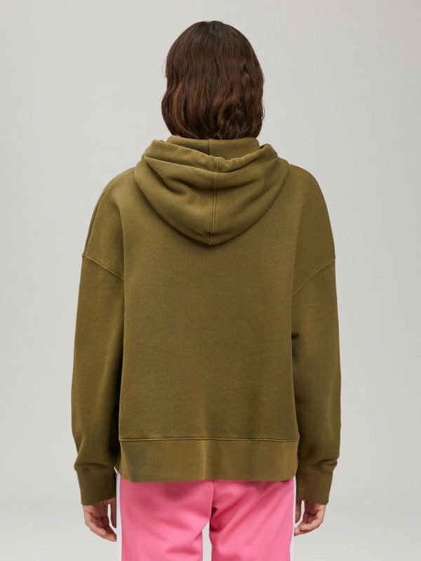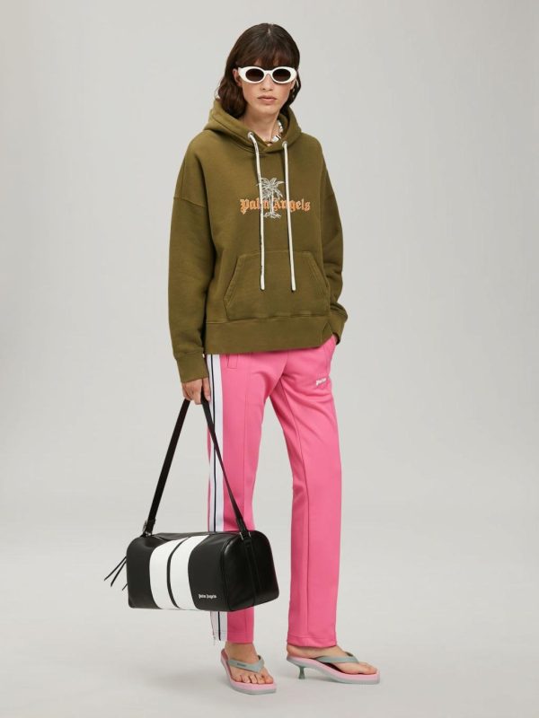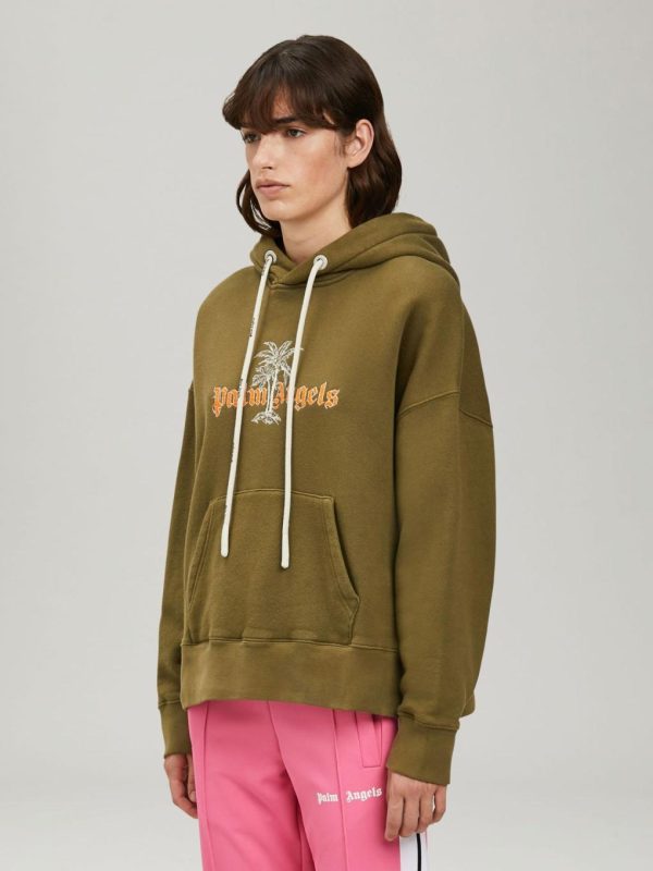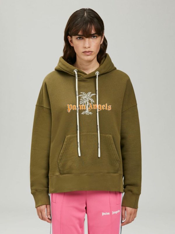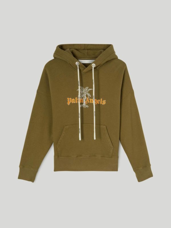 LONG SLEEVES HOODED SWEATSHIRT IN MILITARY GREEN. “PALM ANGELS” WHITE LOGOED DRAWSTRINGS. RIB KNIT CUFFS AND HEM. KANGAROO POCKET. PALM TREE AND ORANGE LOGO EMBROIDERED AT FRONT.