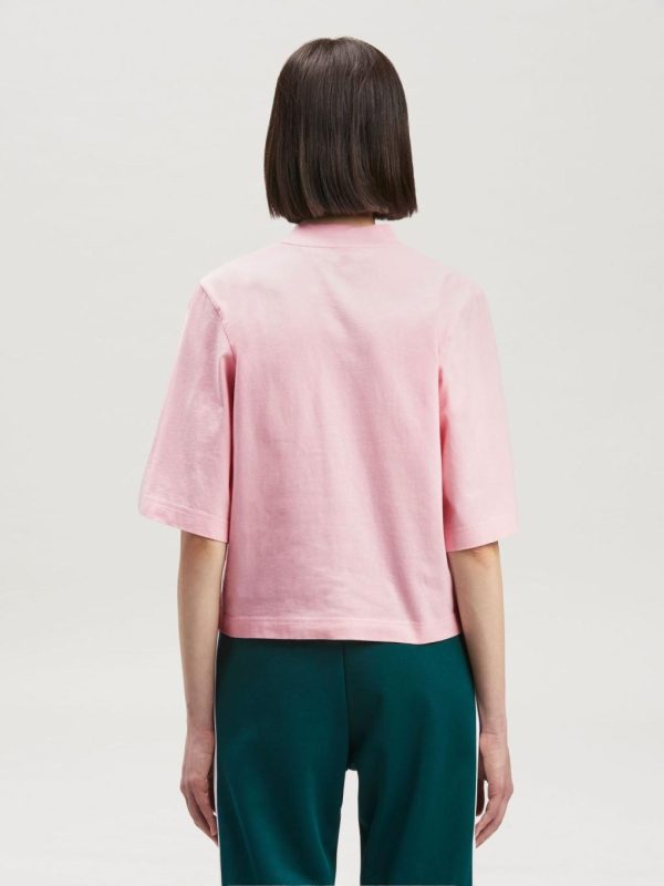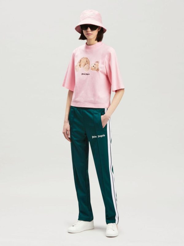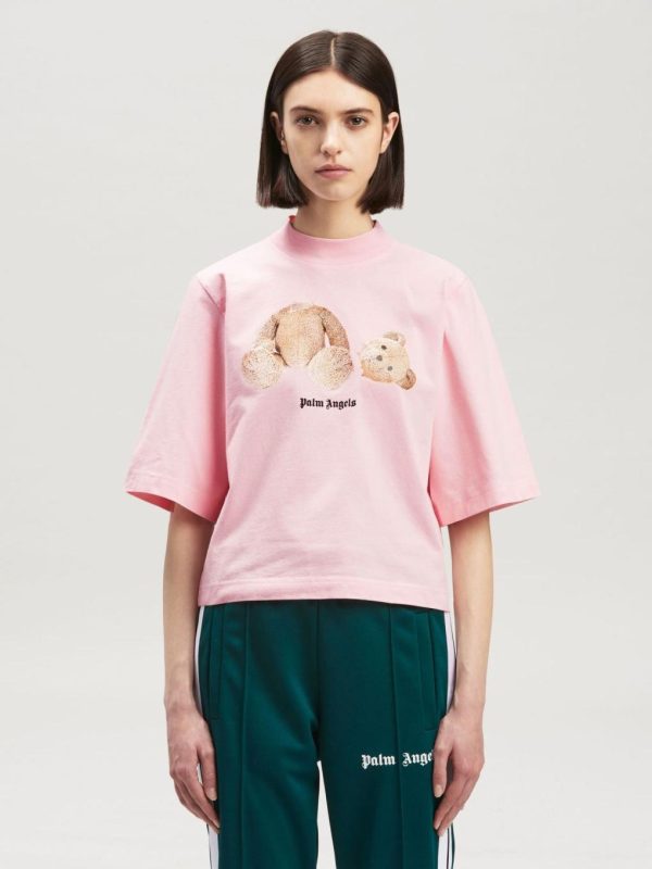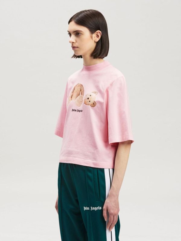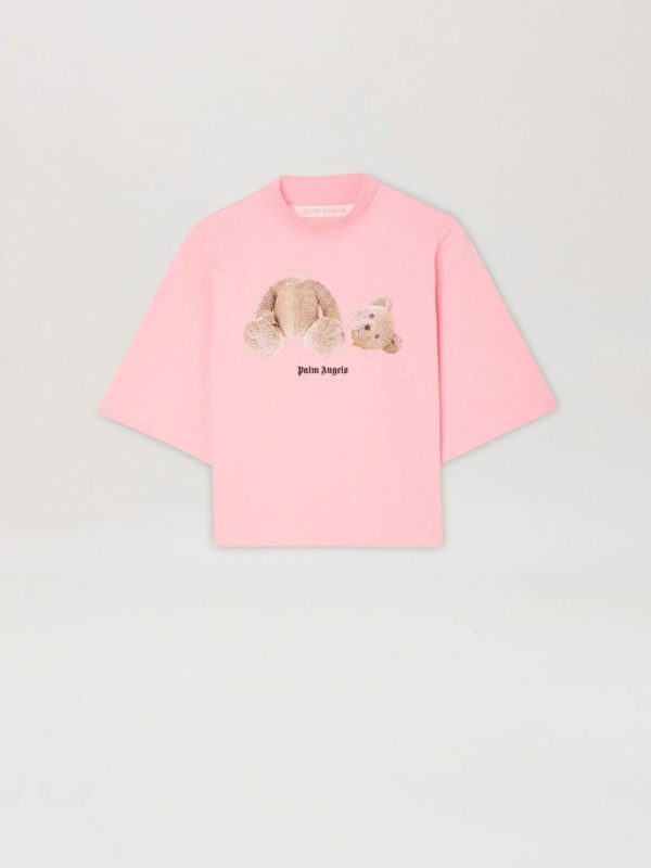 SHORT SLEEVES CROPPED T-SHIRT IN PINK COTTON WITH BEAR GRAPHIC AND BLACK LOGO PRINTED AT FRONT. CREWNECK COLLAR.