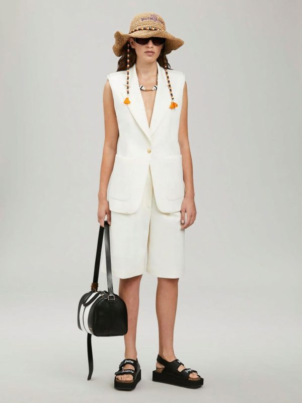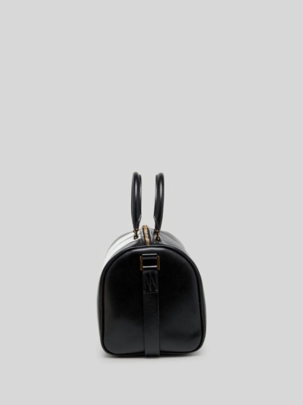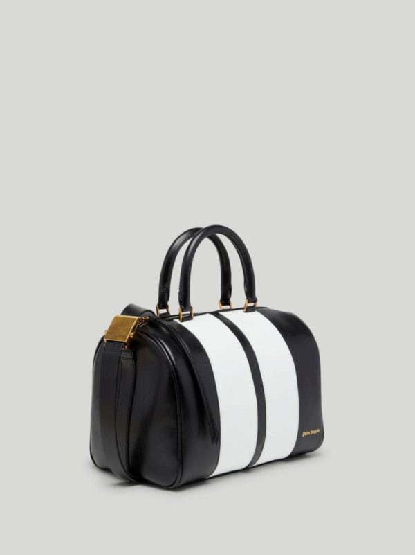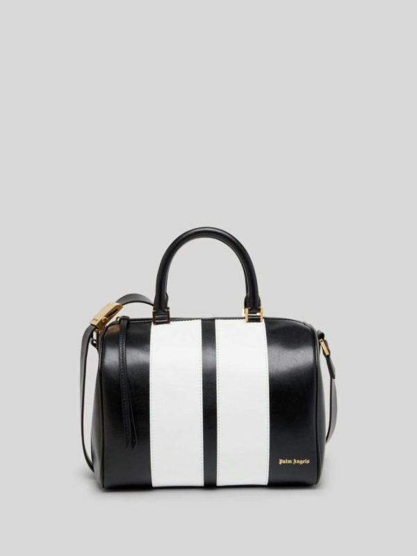 TRACK TRUNK BAG IN BLACK LEATHER. WHITE STRIPE DETAIL. “PALM ANGELS” LOGO PRINTED IN GOLD AT FRONT. BLACK LEATHER SHOULDER.